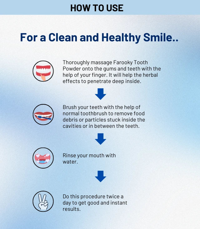 - Massage: Begin by massaging the Farooky Tooth Powder onto your gums and teeth using your finger. This process enables the herbal benefits to penetrate deeply, promoting healthier gums and teeth.