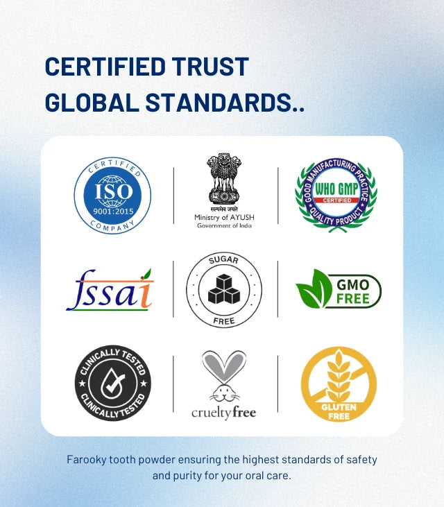 Yes, Farooky Tooth Powder is certified and licensed by several organizations attesting to its quality and safety. It holds the Ayush License, GMP (Good Manufacturing Practice) License, FSSAI (Food Safety and Standards Authority of India) License, among others, ensuring it meets the highest standards for herbal products.