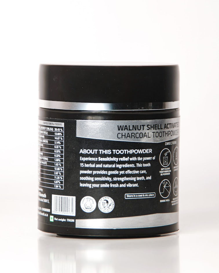 This advanced toothpowder blends activated charcoal from walnut shells with 15 carefully selected herbal ingredients, offering gentle cleansing, sensitivity relief, and gum protection without compromising on safety or quality.